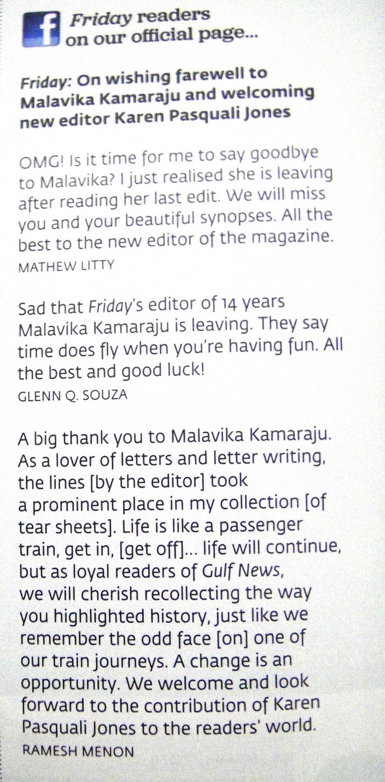 On wishing farewell to Malavika Kamaraju and welcoming new editor Karen Pasquali Jones – Friday magazine
