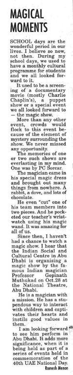 Since then, I haven’t had a chance to watch a magic show. I hear that the Indian Social and Cultural Centre in Abu Dhabi is organising a magic show by the famous Indian magician Professor Gopinath Muthukad on Oct.28 at the National Theatre, Abu Dhabi.