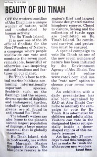 A special campaign to vote Bu Tinah as one of the new seven wonders of nature has been initiated by the Environment Agency of Abu Dhabi. You may visit online http://www.vote7.com and use the “vote now” option to choose your seven wonders.