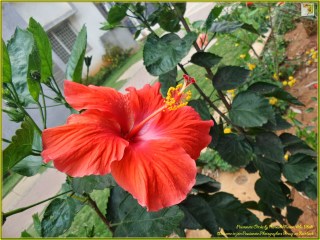 Hibiscus rosa-sinensis is a bushy, evergreen shrub or small tree growing 2.5–5 m (8–16 ft) tall and 1.5–3 m (5–10 ft) wide, with glossy leaves and solitary, brilliant red flowers in summer and autumn. The 5-petaled flowers are 10 cm (4 in) in diameter, with prominent orange-tipped red anthers.