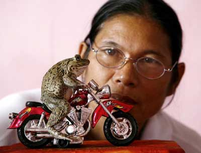 Tongsai Bumroongtai, 52, looks on her pet black spotted female frog ‘Nong Oui’ as it sits astride a toy motorbike in the resort city of Pattaya, Chonburi province, Thailand, on February 10, 2008. Tongsai found the amphibian eleven months ago and trained her pet frog, ‘Nong Oui’ to sits on toy motorbike, a battery-operated dumper truck and lies on a plastic bottle in various positions for show and claiming she could speak to the frog.