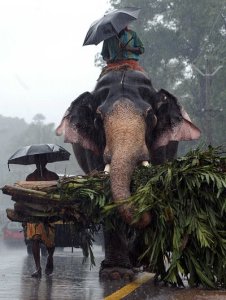 The umbrella is for the mahout or the elephant?. Both ways, it’s raining heavily. Where are the photos……………..?