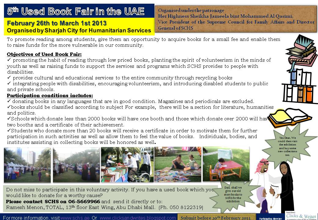 They all work under the directives of Her Highness Sheikha Jameela Bint Mohammed Al Qasimi, to make the Used Book Festival through perfect organisation, innovative ideas, and the increase in the number of displayed books and revenues that serves the public interest of people with special abilities and the society as well. Special attention has been taken to maintain the pricing of books in the fair between one dirham and twenty dirhams, providing an opportunity for all, to get books at nominal prices.