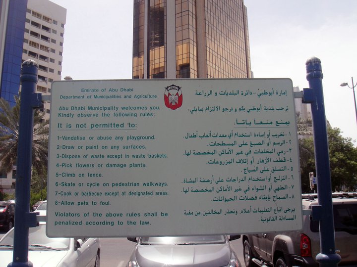 Signs and informations – A sign board at Corniche park in Abu Dhabi