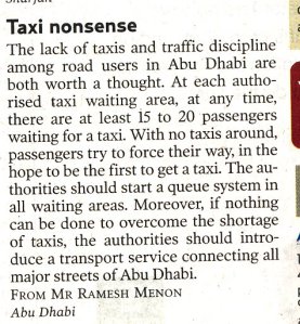 The taxi problems and my pursuit to find a solution for Abu Dhabi road users continues…. If you wish to support me in this, log on to Gulf News (http://www.gulfnews.com/opinion/letters/letters.html) page and express your own comments. Pass it on to any of your colleagues or friends who is experiencing this situation these days while coming and going to office. If we don’t express our problems, no one will realise it.