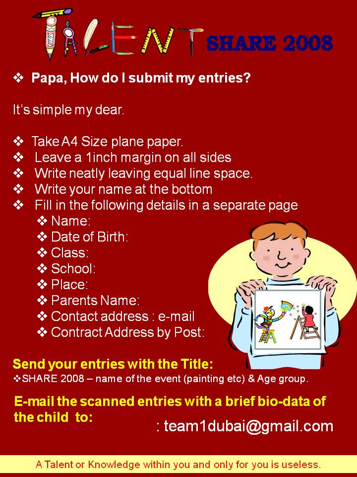 With this view in mind, we present to you on behalf of Team 1 Dubai and Athaani blogspots, the first ever on-line talent hunt – SHARE 2008.