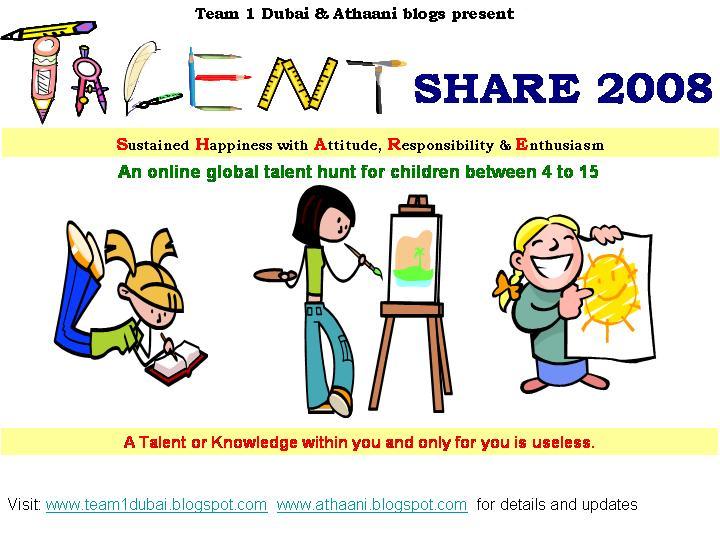 With this view in mind, and with the encouragement obtained by the recently concluded TALENT SHARE 2008 Online competition, we present to you on behalf of Team 1 Dubai and Athaani blogspots, TALENT SHARE, a blog purely dedicated to promote creative talents.