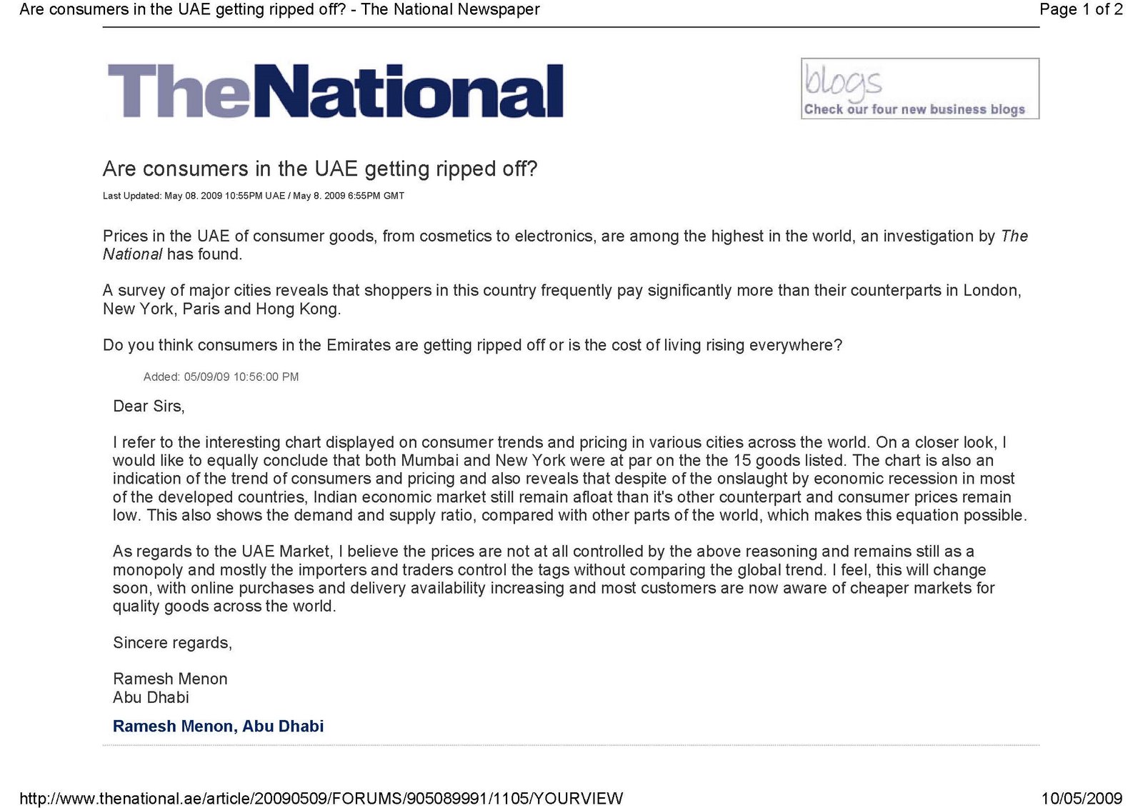 My Letters – THE NATIONAL – Are consumers in the UAE getting ripped off?