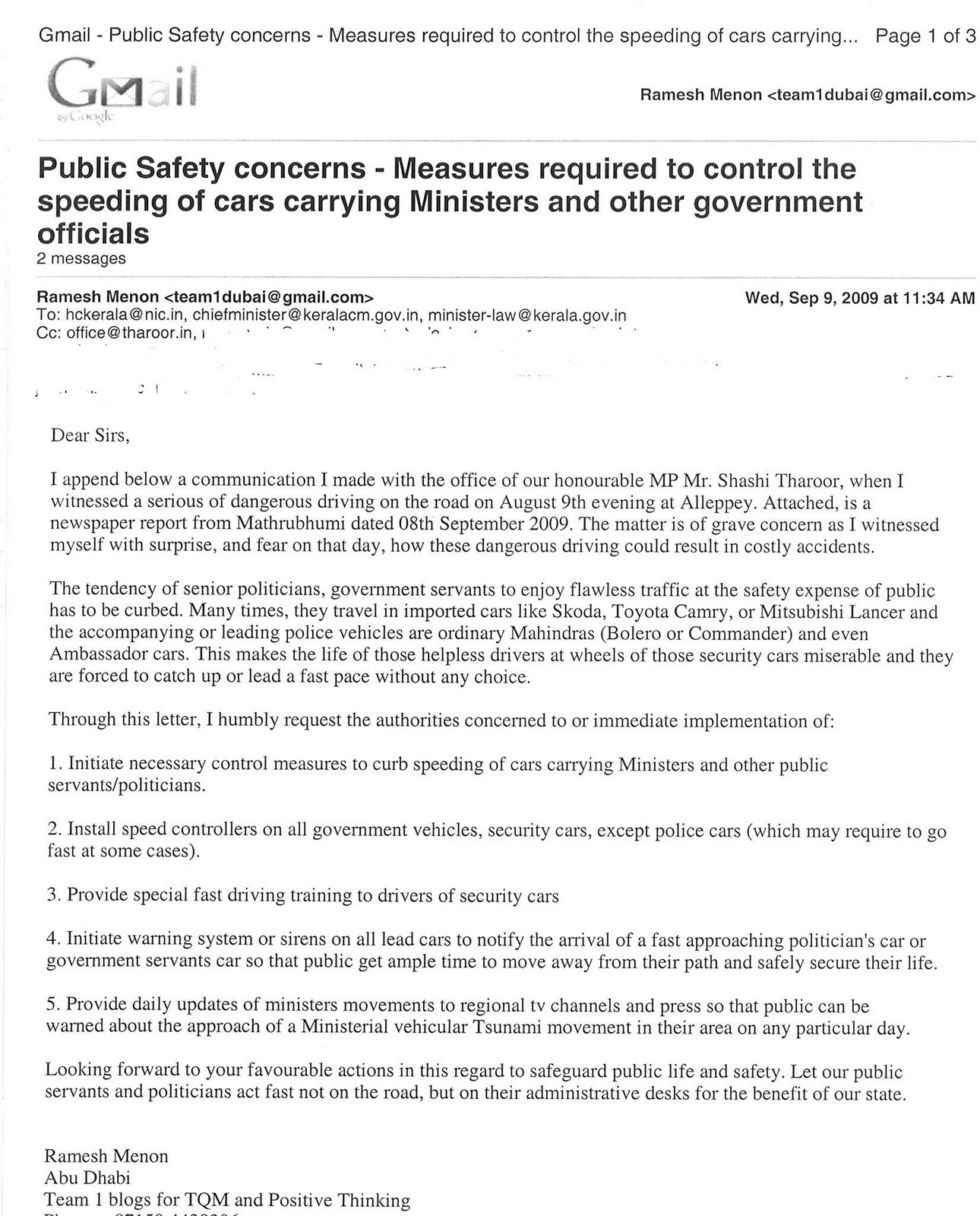 Public Safety concerns – Measures required to control the speeding of cars carrying Ministers and other government officials